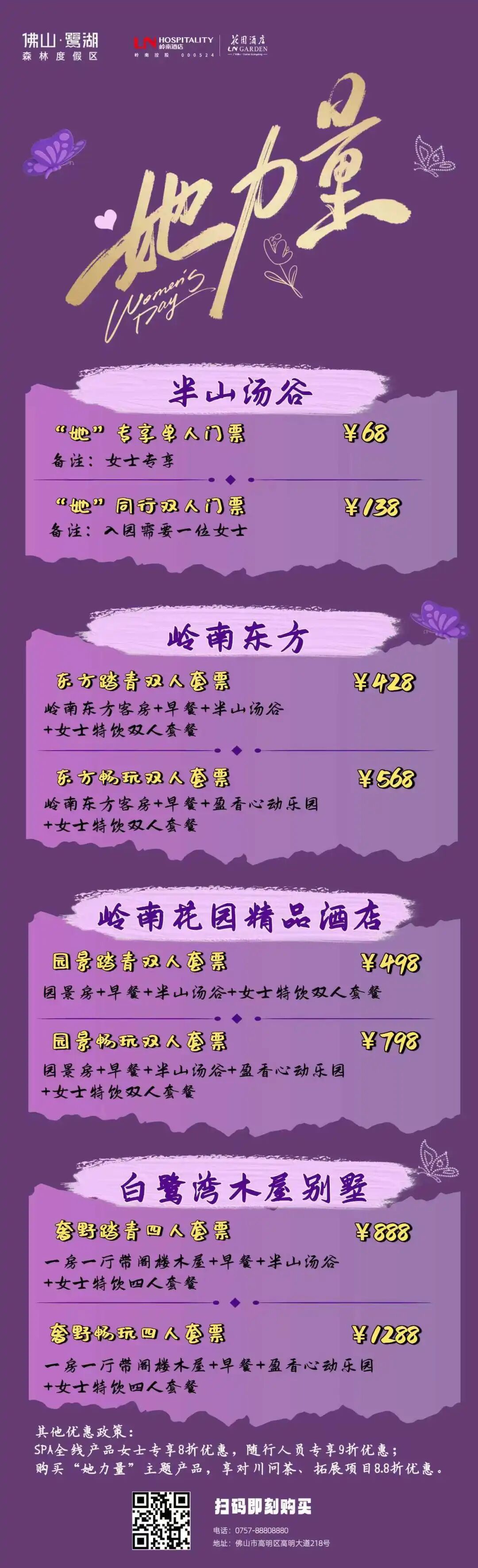 3月8日起,每天前40位到店消费68元以上的女士,可获得精美礼品一份。度假区特别推出 “她力量”妇女节特惠套票: